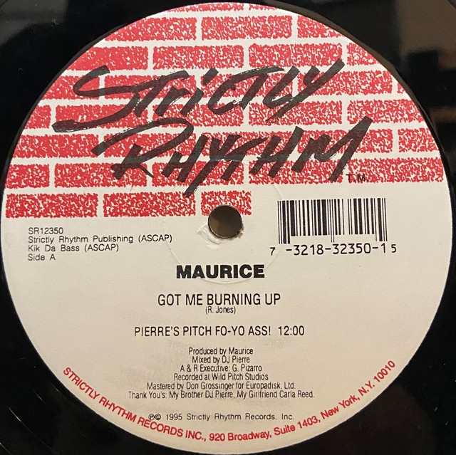 Maurice – Got Me Burning Up (Strictly Rhythm – SR12350 / 12" / US / 1995) ミッド90sのNYハウスを象徴する一枚にして、DJ Pierre のワイルド・ピッチ美学が炸裂したクラシック。 King Mauriceのオリジナルを、兄であるDJ Pierre自らが徹底的にフロア仕様へと拡張した、Strictly Rhythm屈指の強力盤です。 A面「Pierre’s Pitch Fo-Yo Ass!」は12分に及ぶロング・エクステンデッド。 太く重たいキックがうねり続け、荒々しくも艶のあるベースライン、ファンキーでアシッディーなシンセ、そしてワイルド・ピッチ特有の浮遊感あるストリングスが重なり合う構成は、まさにDJ Pierre節の真骨頂。展開を急がず、グルーヴそのものの力でフロアを掌握する圧巻の仕上がりです。 B1「Maurice’s Phat Pitch」は、オリジナル作者自身によるアプローチ。 タイトながら腰のあるピッチ感を保ちつつ、イントロのつんのめるような重いキックと、レゾナンスの効いたハットが際立ち、ロングミックスで真価を発揮するDJフレンドリーな内容となっています。 DJ Pierreによるリミックス、Gladys PizarroのA&R、Don Grossingerのマスタリングという布陣が揃った時点で、クオリティは折り紙付き。 ミッド90sのNYハウス、ワイルド・ピッチ、Strictly Rhythm黄金期を語るうえで外せない、今なおフロアで燃え続ける一枚です。 A Got Me Burning Up (Pierre's Pitch Fo-Yo Ass!) 12:00 B1 Got Me Burning Up (Maurice's Phat Pitch) 7:25 B2 Got Me Burning Up (Wild Beats) 4:15 状態 メディア: VG+ スリーブ: Generic コンディションランク MINT(M) Near Mint(NM) Very good Plus(VG+) Very good(VG) Good Plus(G+) Good(G) Fair(F) Poor(P) 01702