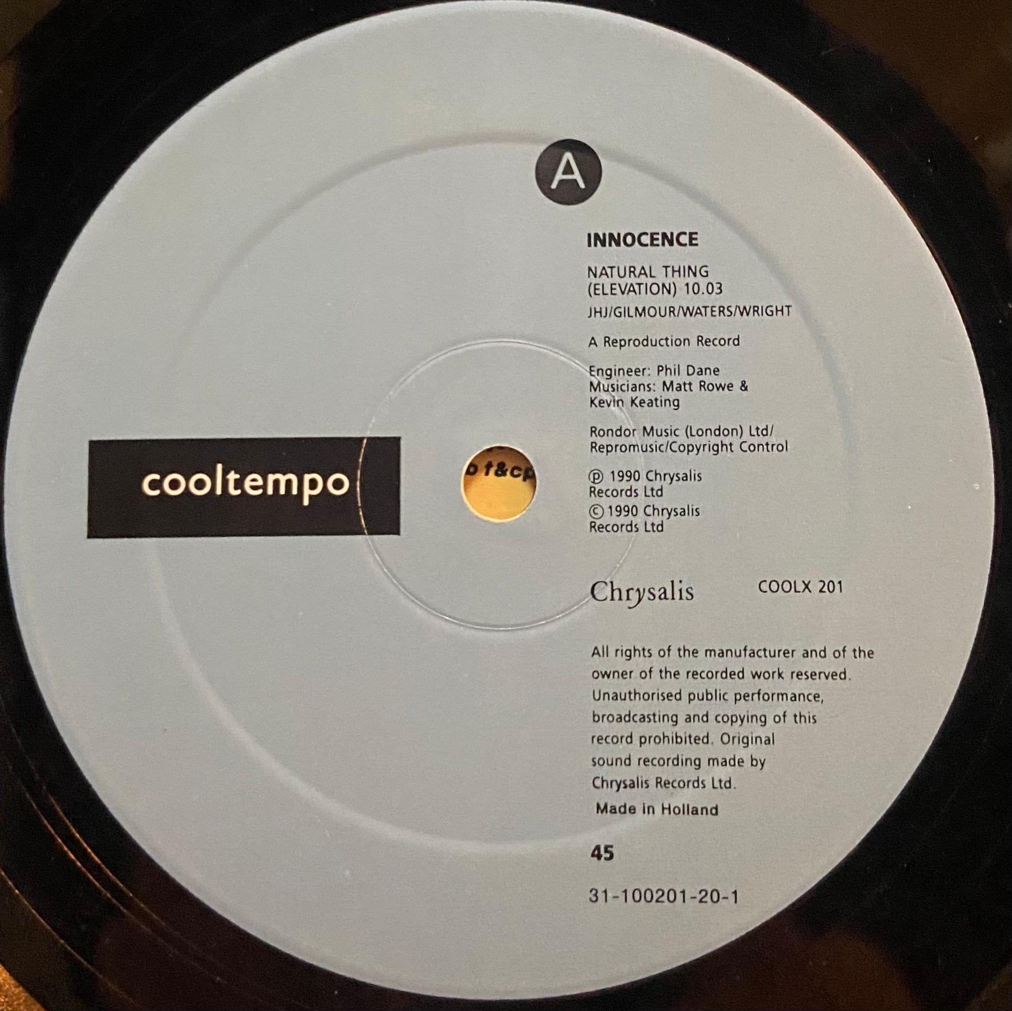 A面「Natural Thing (Elevation)」は、Pink Floyd「Shine On You Crazy Diamond (Parts I–V)」の印象的なイントロとギター・ソロを大胆にサンプリングしたエクステンディッド・ミックス。アンビエント・ハウスとR&B〜グラウンド・ビートが溶け合う幻想的な展開で、Innocenceのカタログ中でも屈指のハイライトとされる一曲です。