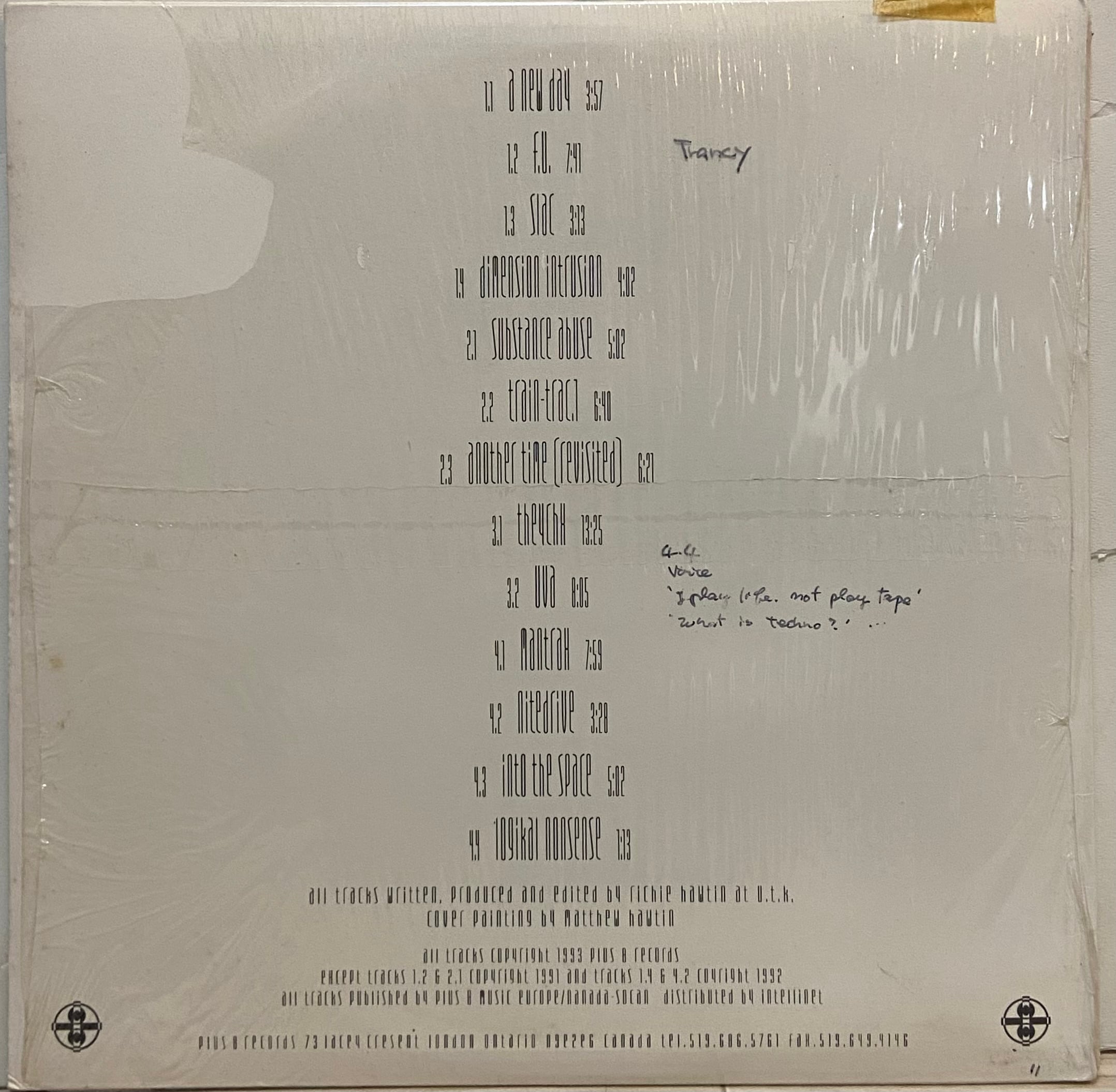 A2「F.U.」やB2「Train-Trac.1」では、ソリッドで疾走感あるミニマル・テクノを展開。一方、「Dimension Intrusion」や「Into The Space」では、サウンドトラック的な浮遊感と内省的なムードを強調。D1「Mantrax」は、現在聴いてもまったく色褪せないレイビーなSF的アンビエント/インテリジェント・テクノの傑作です。